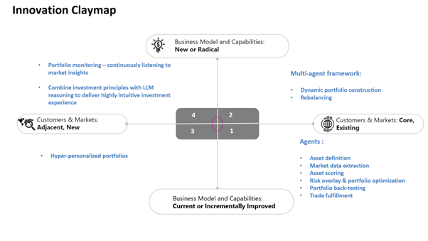 Quadrant 3: How might we break new ground by extending current capabilities to fresh horizons, be it new customers or market segments? Here, strategic partnerships and ecosystem integration open doors to wider accessibility and exponential growth. The multi-agent framework helps wealth management firms to offer hyper personalised portfolios at scale, suiting the unique preferences, constraints and objectives of retail Investors.